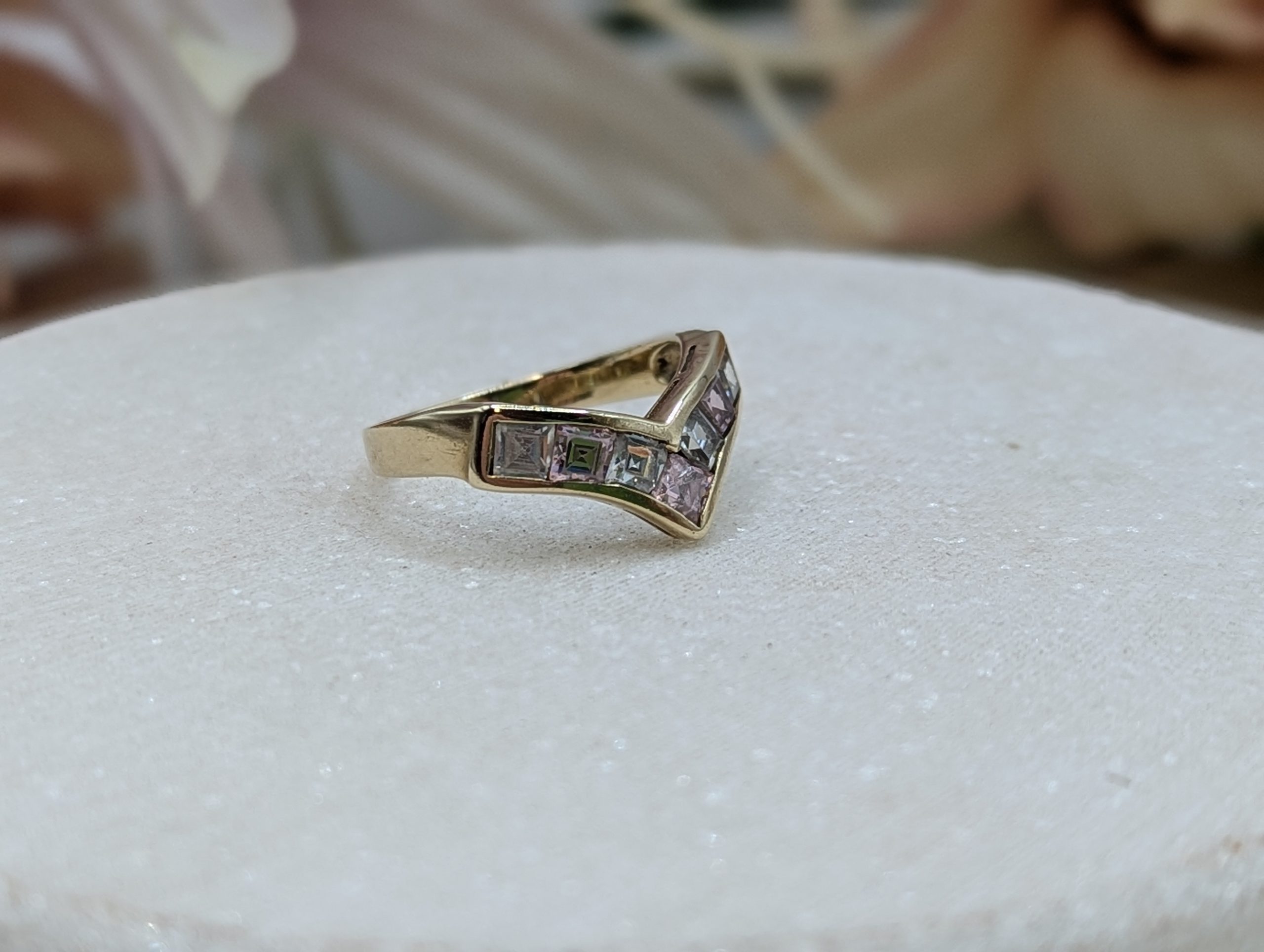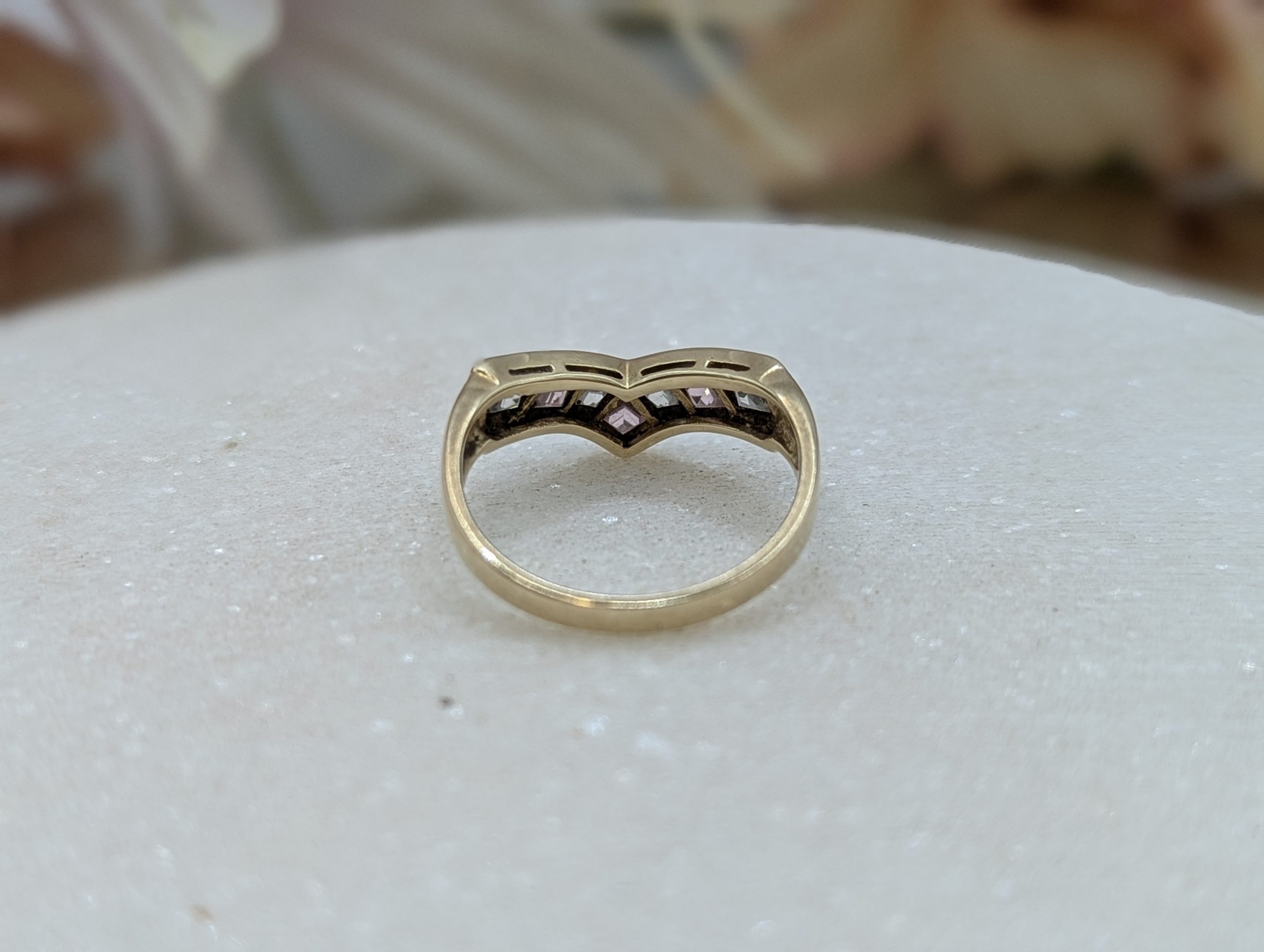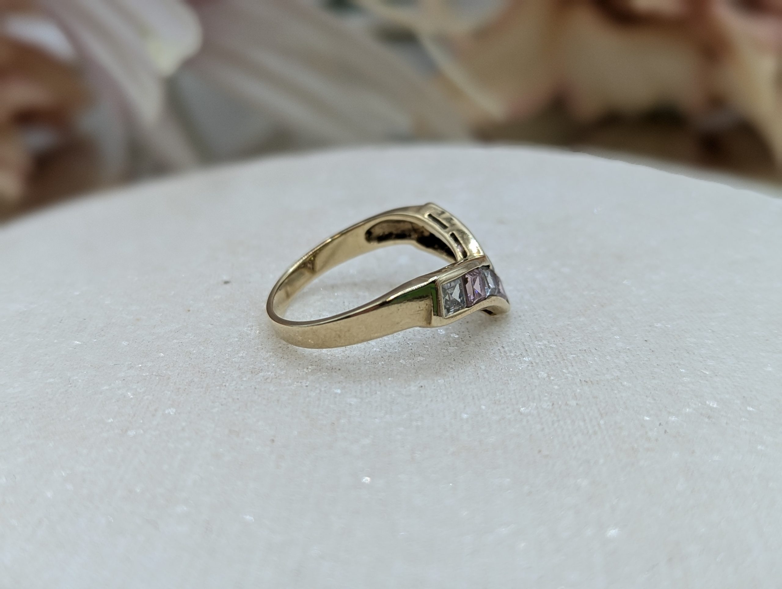 Genuine, Pre-Loved Ladies 9CT Yellow Gold Pink & Clear Stone Ring (2.68gms)