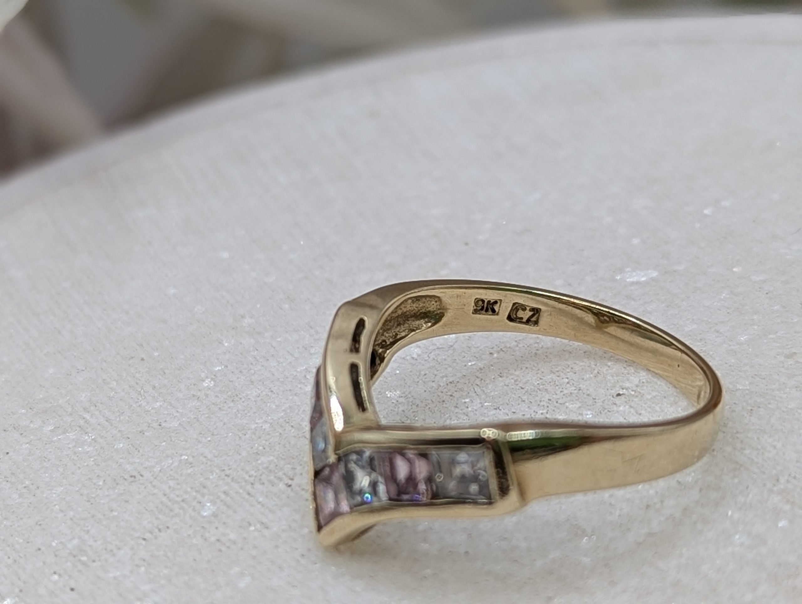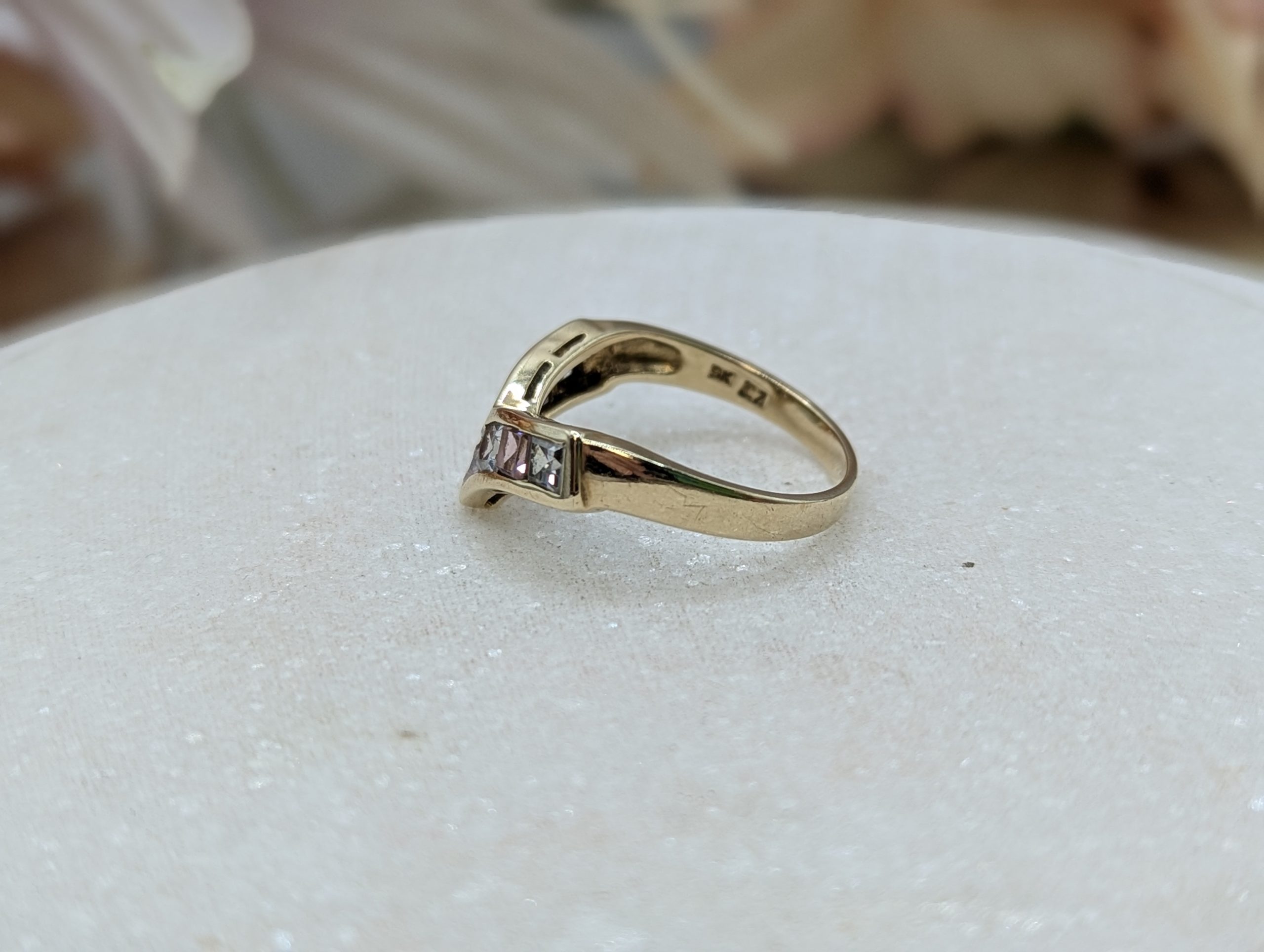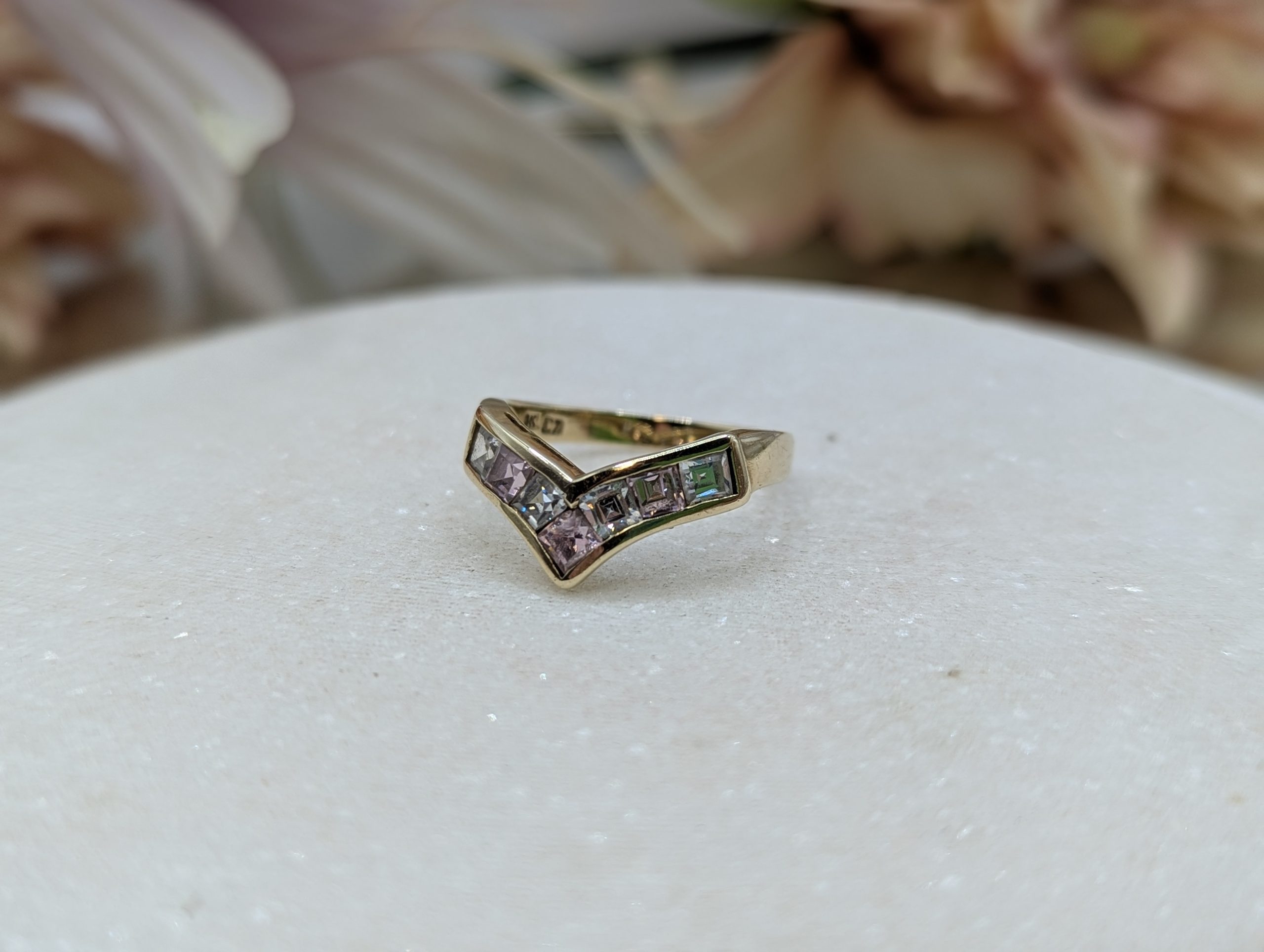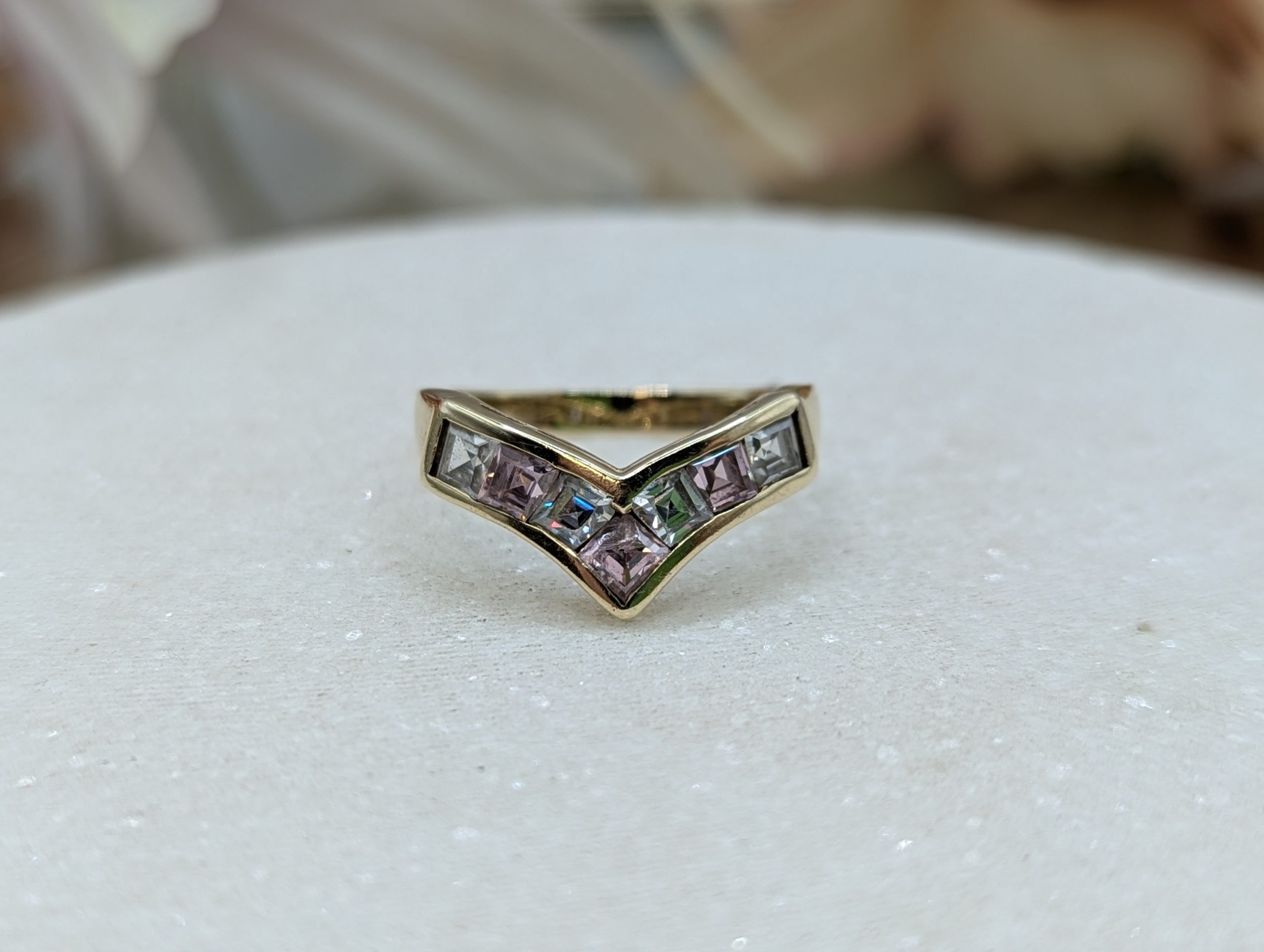 Genuine, Pre-Loved Ladies 9CT Yellow Gold Pink & Clear Stone Ring (2.68gms)