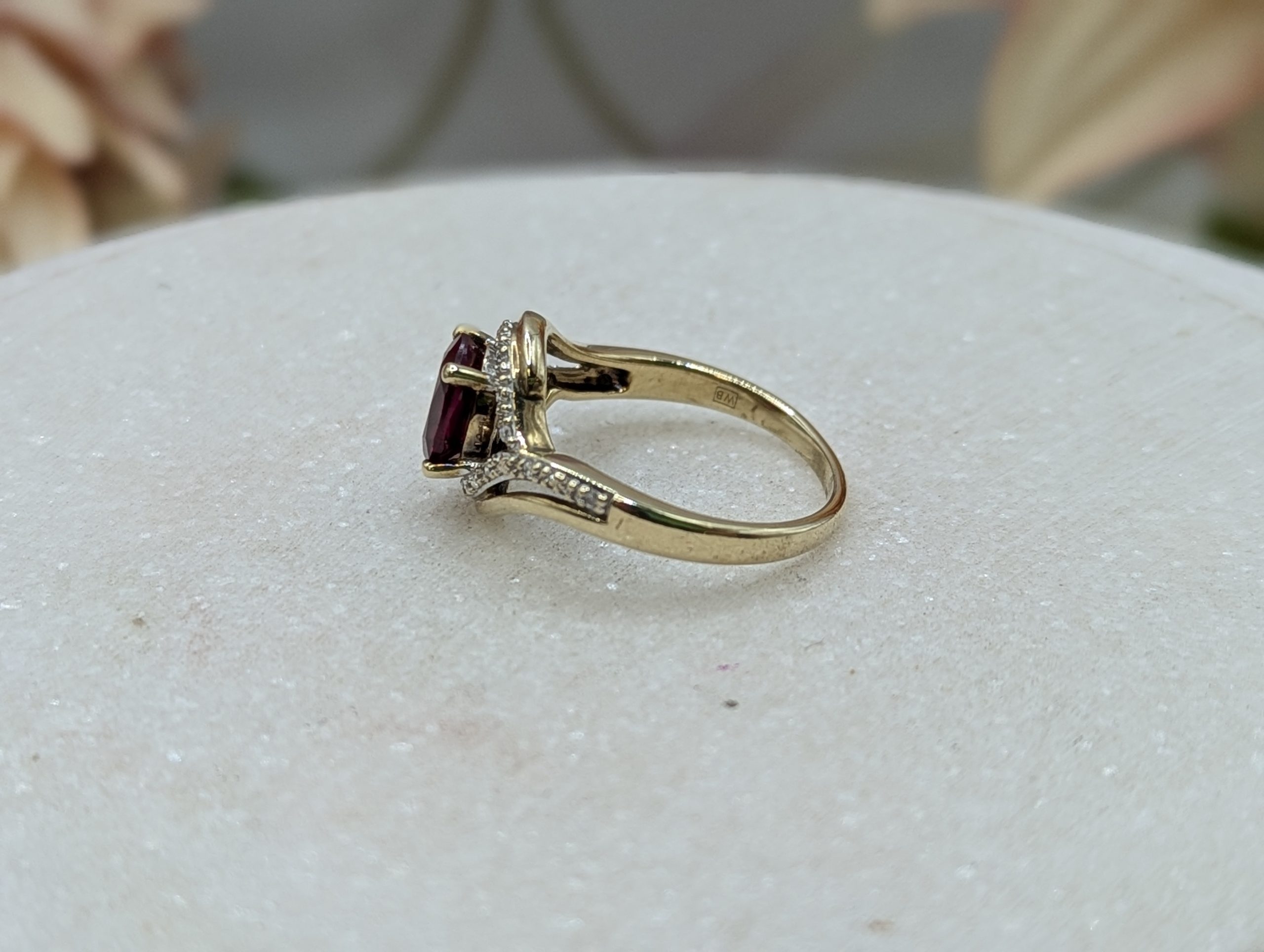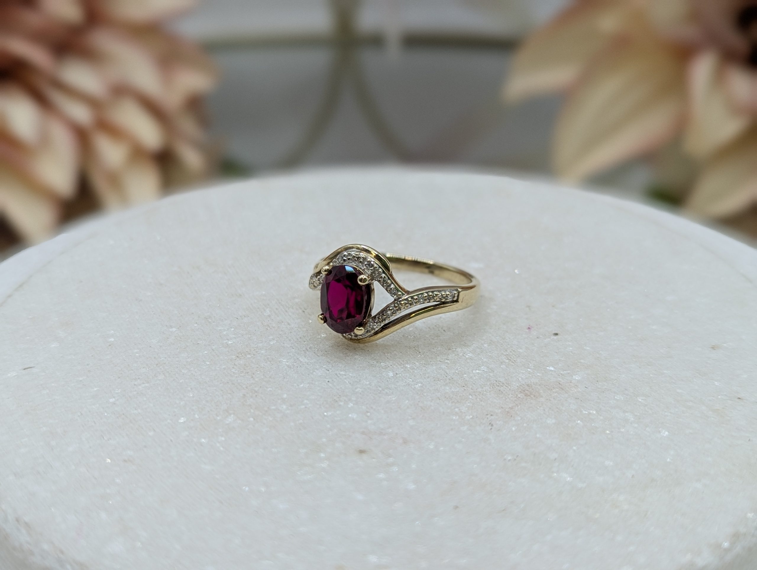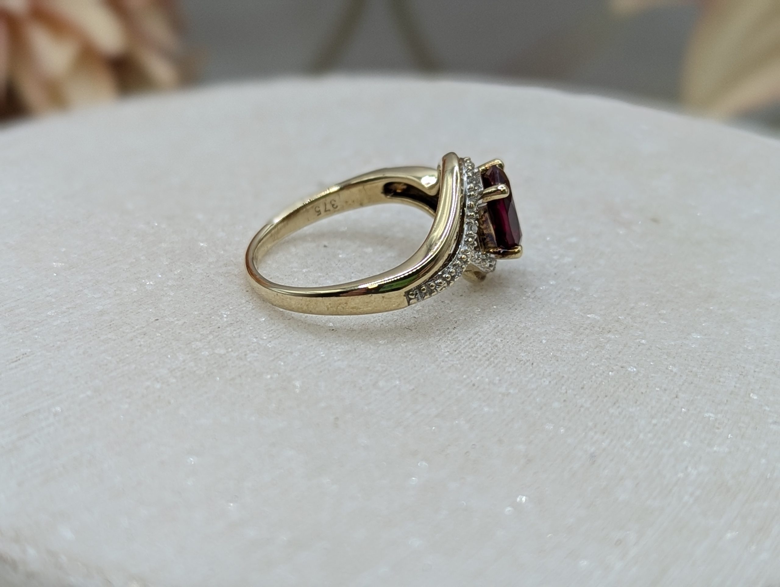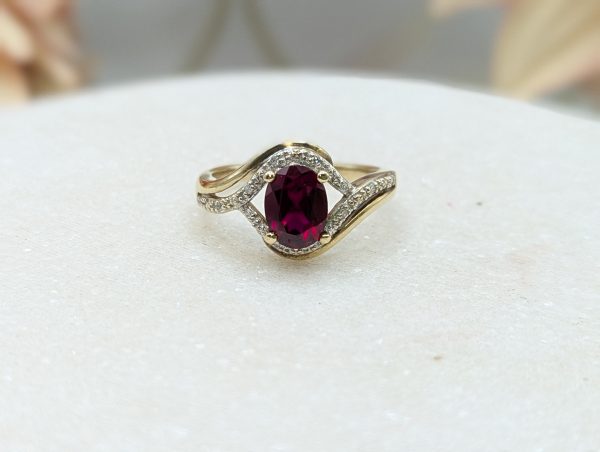 Genuine, Pre-Loved Ladies 9CT Yellow Gold Red Stone & Diamond Ring (3.35gms)