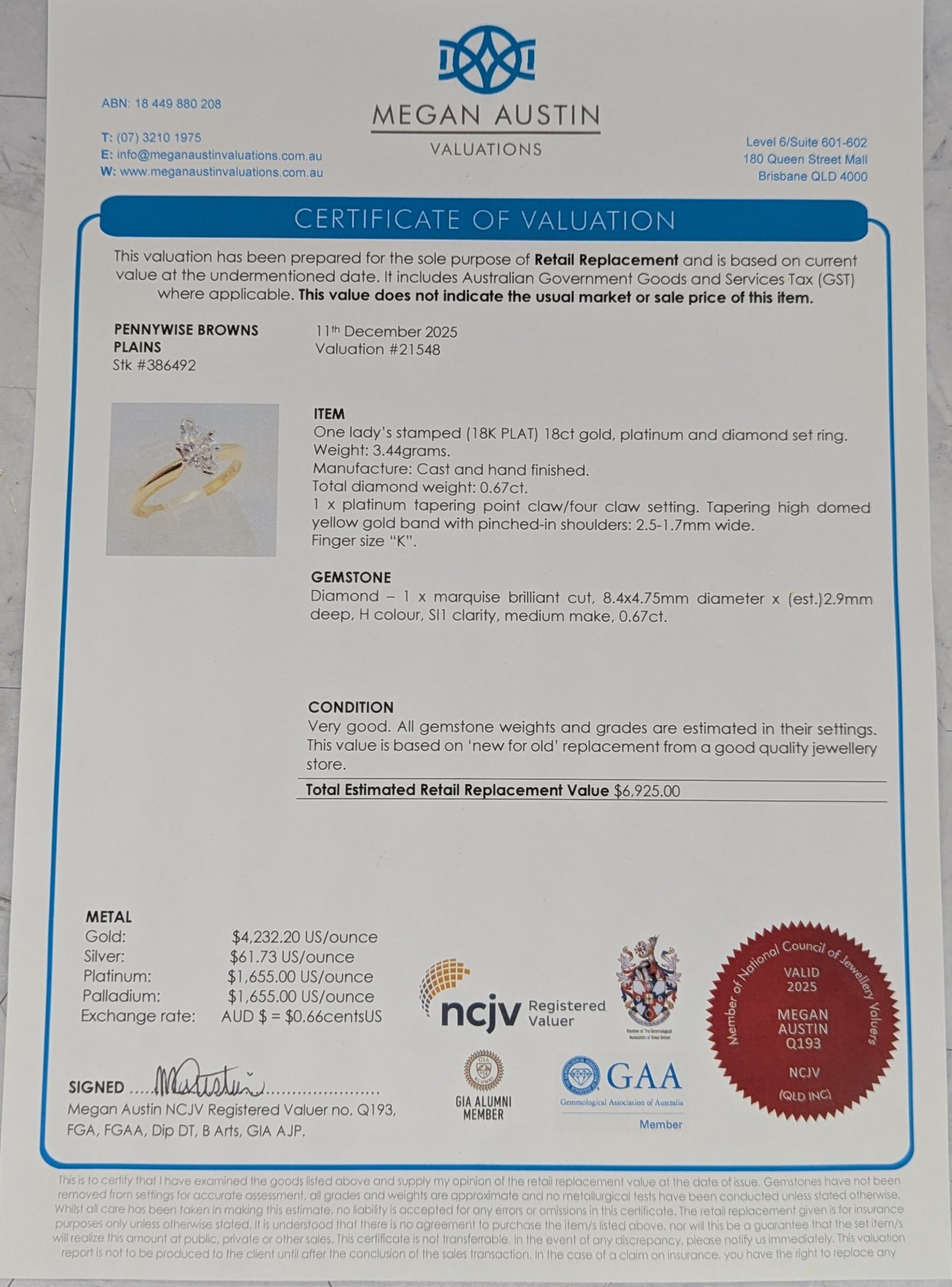 Valuation: $6,925.00 (Megan Austin Valuations, 11th December 2025)